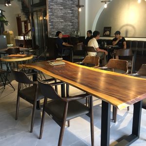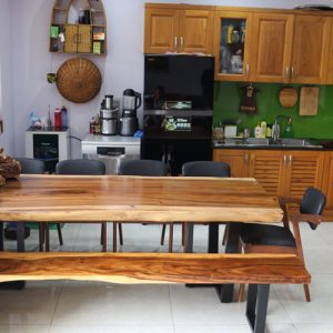 Bàn ăn gỗ tự nhiên me tây nguyên tấm có thể kết hợp với nhiều loại chân bàn và ghế khác nhau cho phù hợp với sở thích của gia chủ.